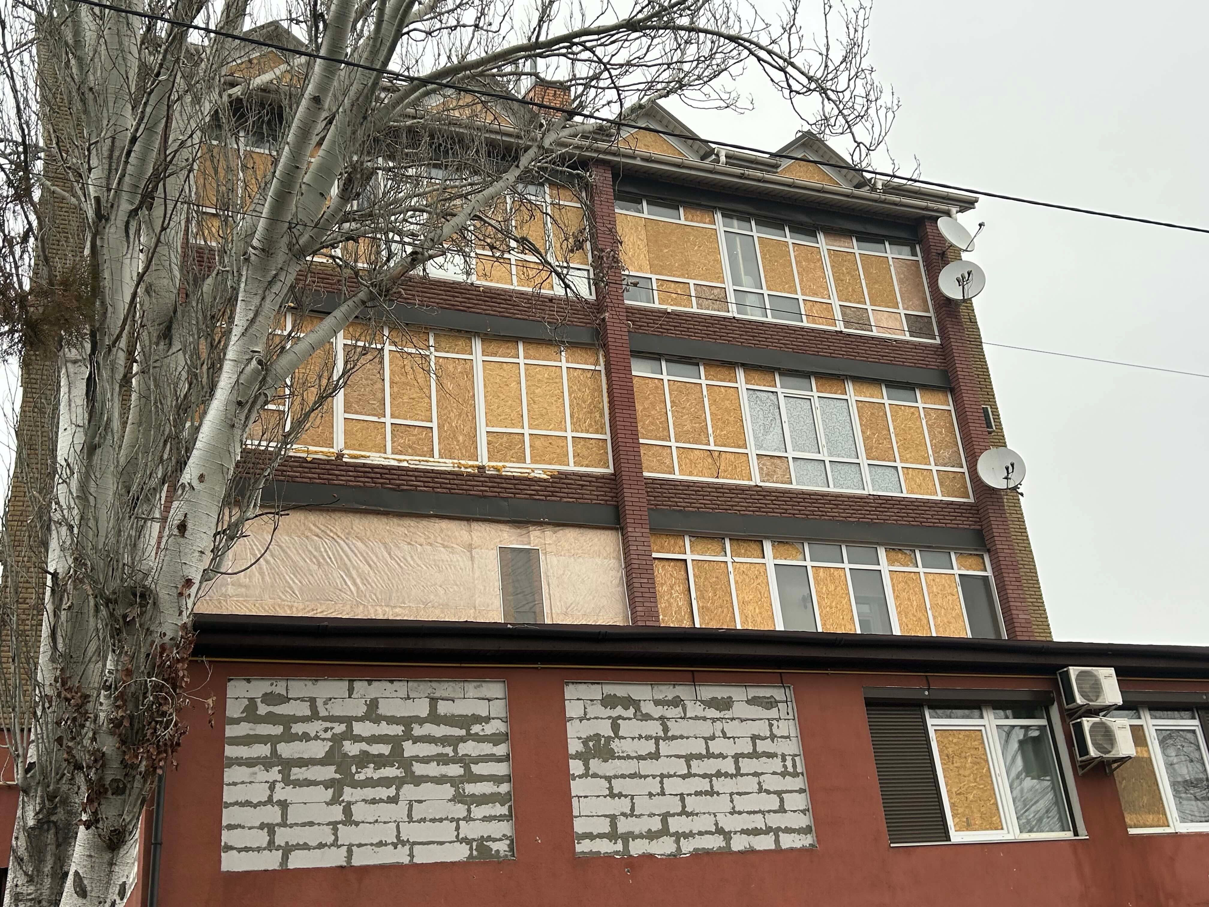 Здание на улице Кузнечной, поврежденное в результате ракетных ударов в марте — апреле 2024 года. Выбитые взрывной волной окна заделаны фанерой. Фото: ЦЗПЧ «Мемориал»